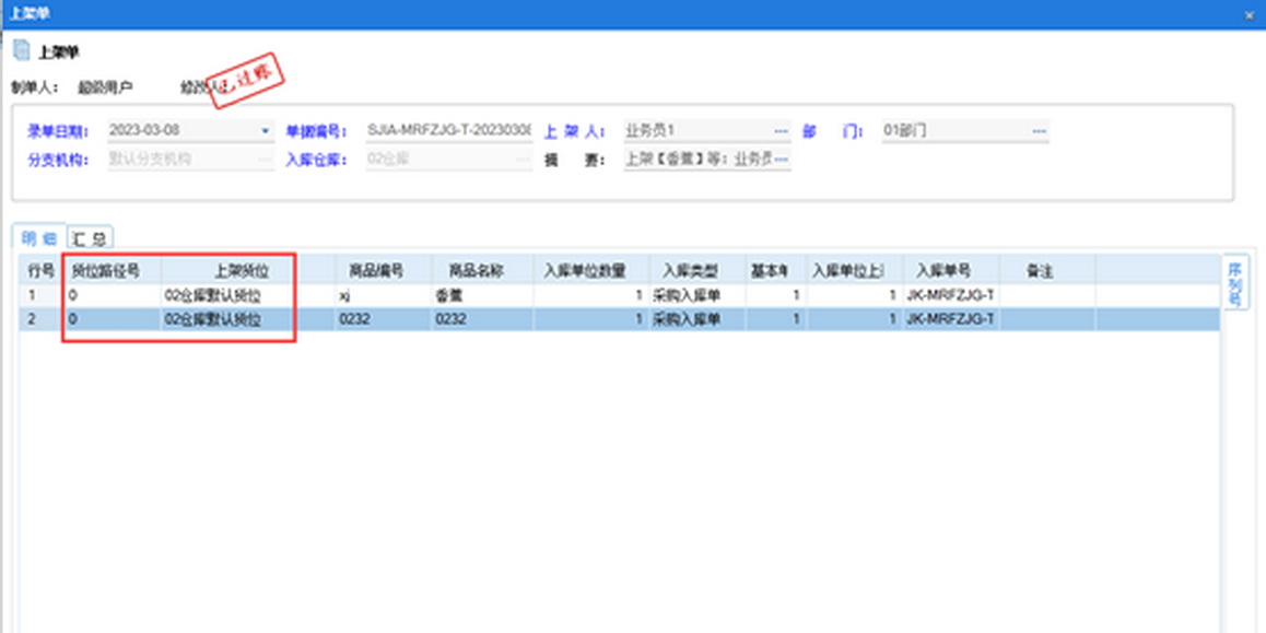 二、仓储运输管理-仓储运输管理-上架单,做上架单调入库单,同一个仓库需要上架的商品可以做在一张上架单中,便于仓库人员根据货位及货位路径号对商品进行上架。