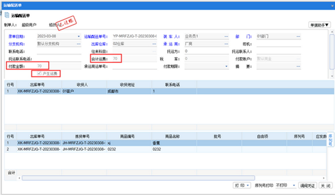 四、仓储运输管理-仓储运输管理-运输配送单,做运输配送单调拣货单,运输配送单可以勾选产生运费,合计运费和付款金额必须一致,运输配送单过账之后,费用类项目【运杂费】会增加,付款账户余额减少。