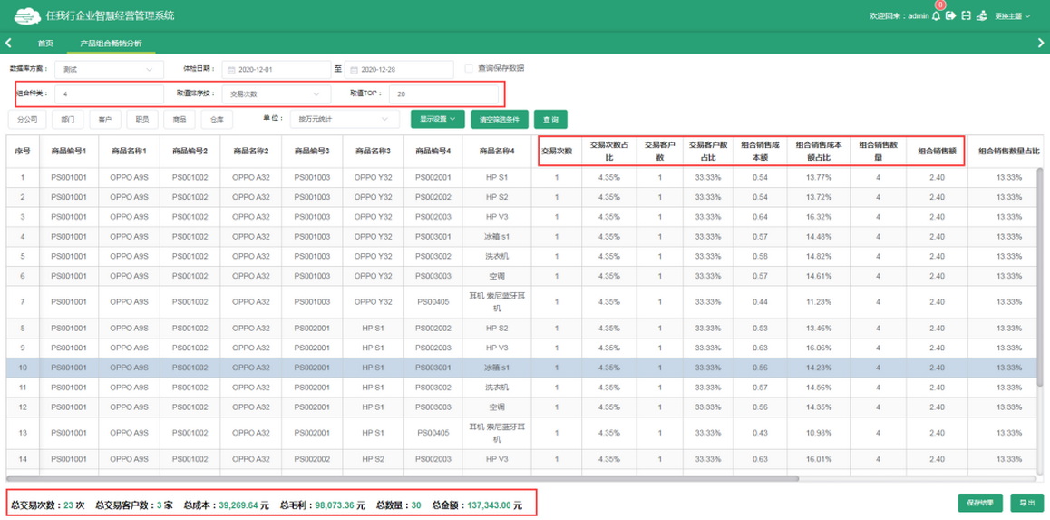 天通眼通过对企业历史营销数据的分析,快速分析出各个产品组合销售的次数、毛利、销售客户数等,通过这样的分析,可以把组合销售最好的前几位组合品类,让我们的销售人员记录下来,后续销售时可实现主动推荐,这样实现组合销售的几率会更高;同时也会带动企业整体销售数据(天通眼可按组合销售次数、组合销售毛利、组合销售数量、组合销售金额进行降序排序取值,满足不同行业的业务需求)。