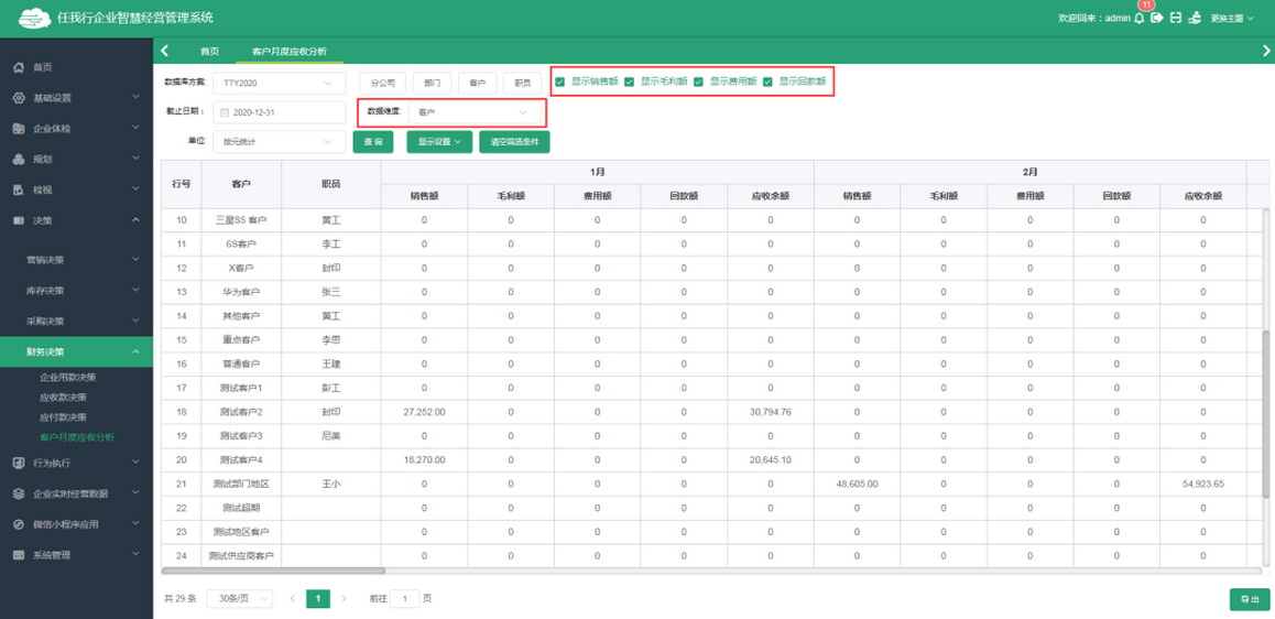 天通眼提供一张月度应收分析表,企业可通过此表分析出各个客户或各个职员各月度的应收、回款、毛利、销售额、费用额的变化对比状况,帮助企业管理层把控企业应收风险。