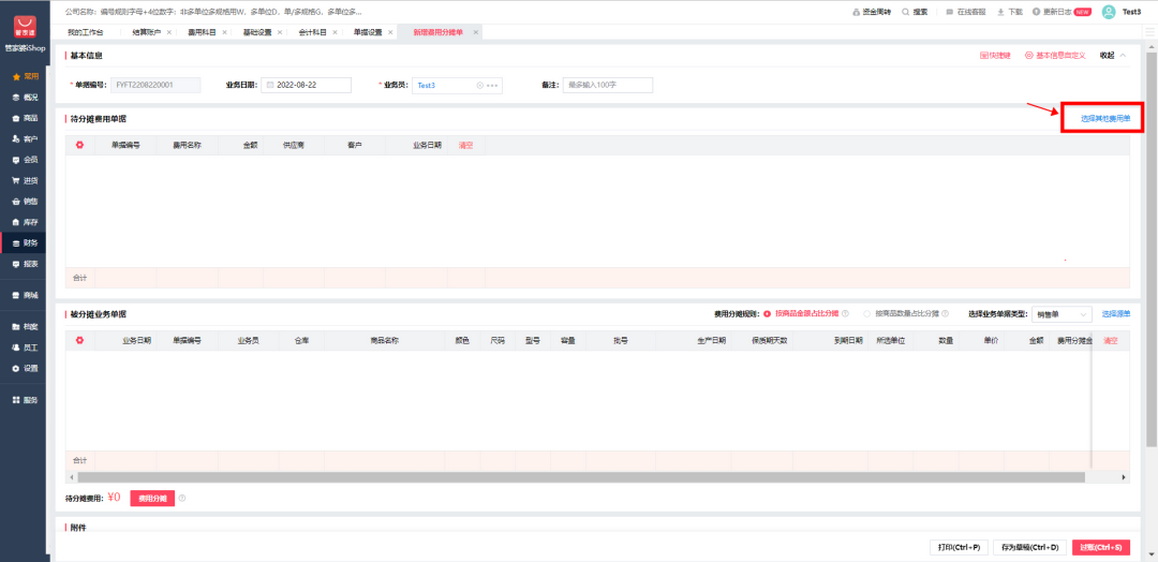 选择需要分摊的费用单据,可选单据状态为已过账的【其他费用单】