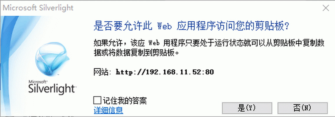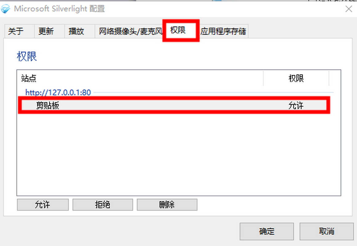 如果不小心点击了“否”,请按下面的方法操作:点击电脑里的开始——所有程序——从中找到silverlight程序——双击——权限——将剪切板设置为“允许”即可。