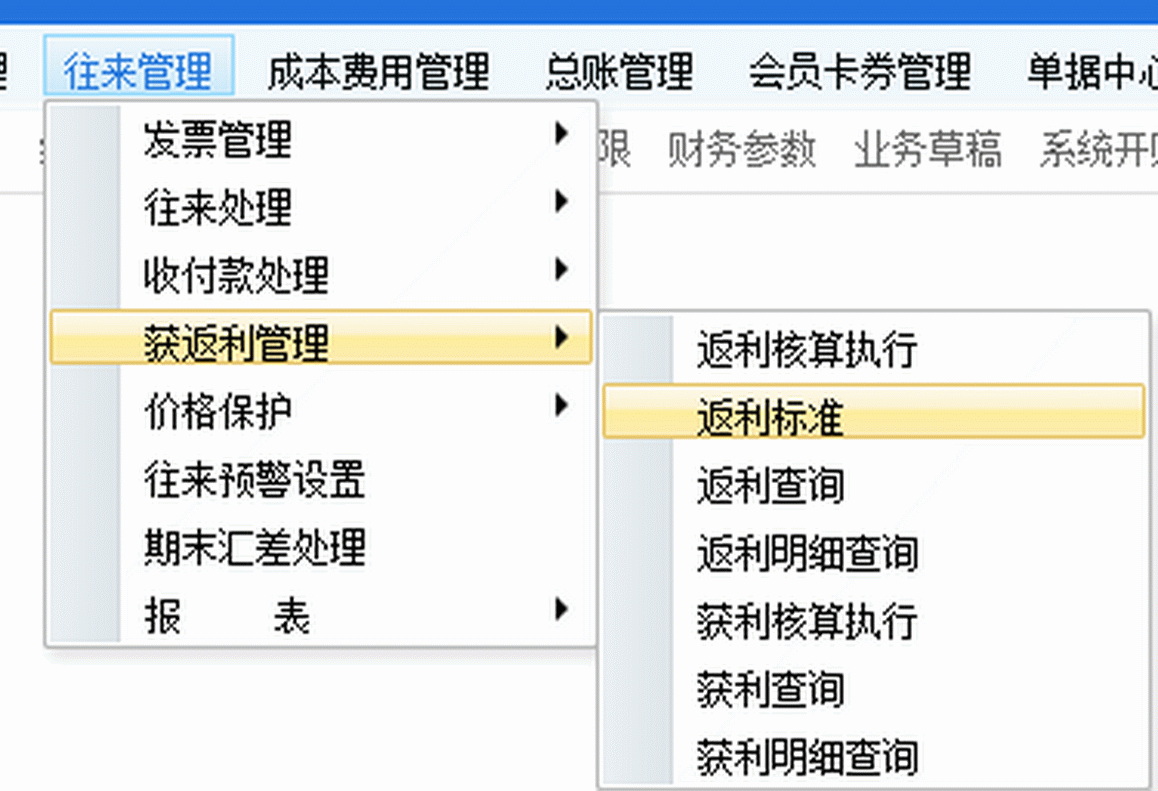 1、往来管理—获返利管理—返利标准,设置返利标准。