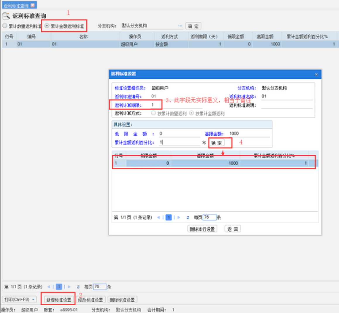 2、例如截图的返利标准:按累计金额返利,金额在0-1000之间参与返利,返利百分比1%。