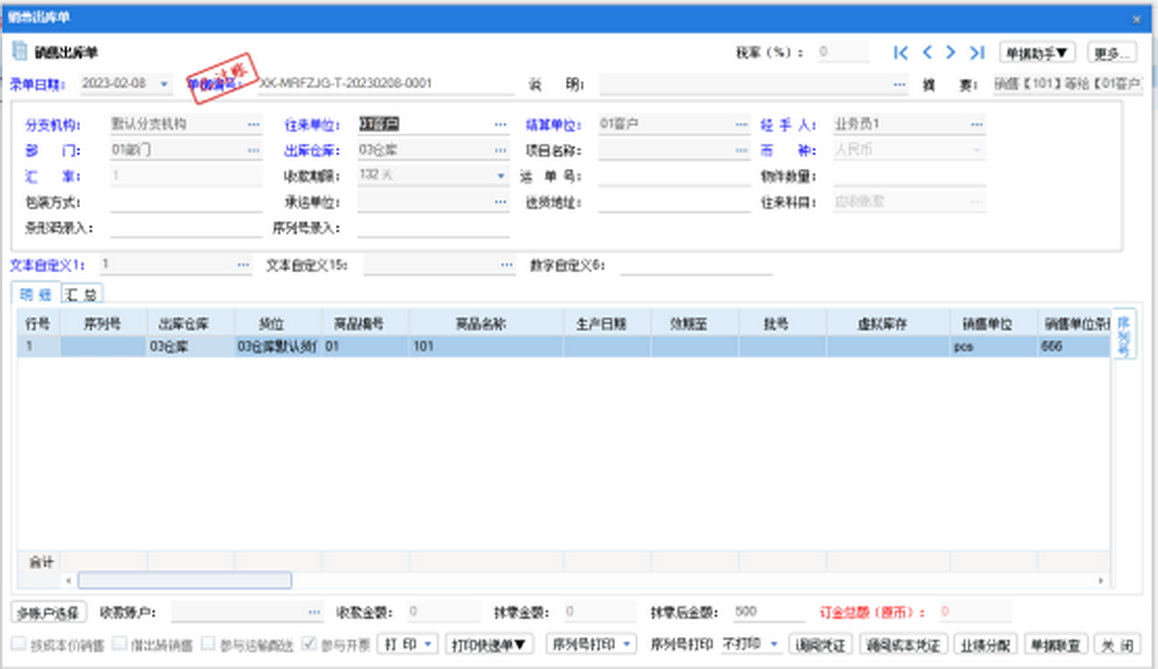 3、【01客户】做了一张销售出库单,销售金额是500。
