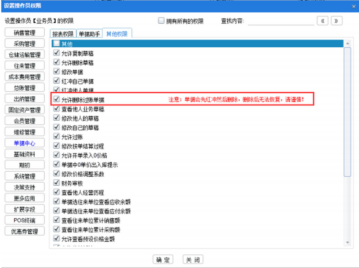 3、普通操作员受“操作员权限—单据中心—其他权限—允许删除过账单据”权限控制,该权限默认是不勾选的。