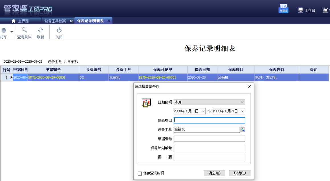 在管家婆工贸PRO制造管理平台中,我们将设备的管理纳入体系【业务管理-设备工具管理】,通过【保养项目】、【保养计划】、【保养记录】、【借出与归还管理】、【故障维修】等多维度、精细化的管理要点,来保障各类生产设备工具的高效运转和使用。