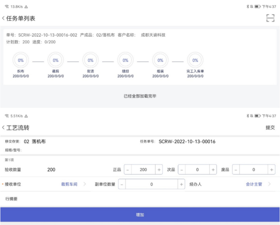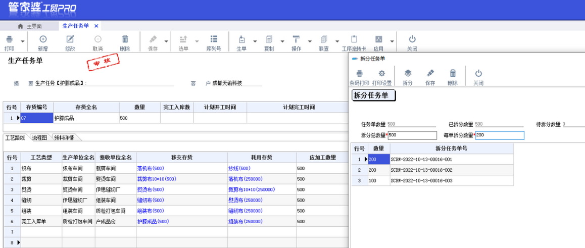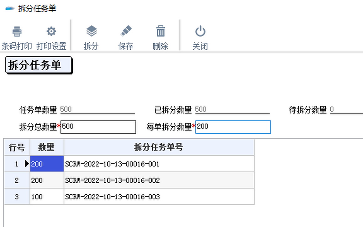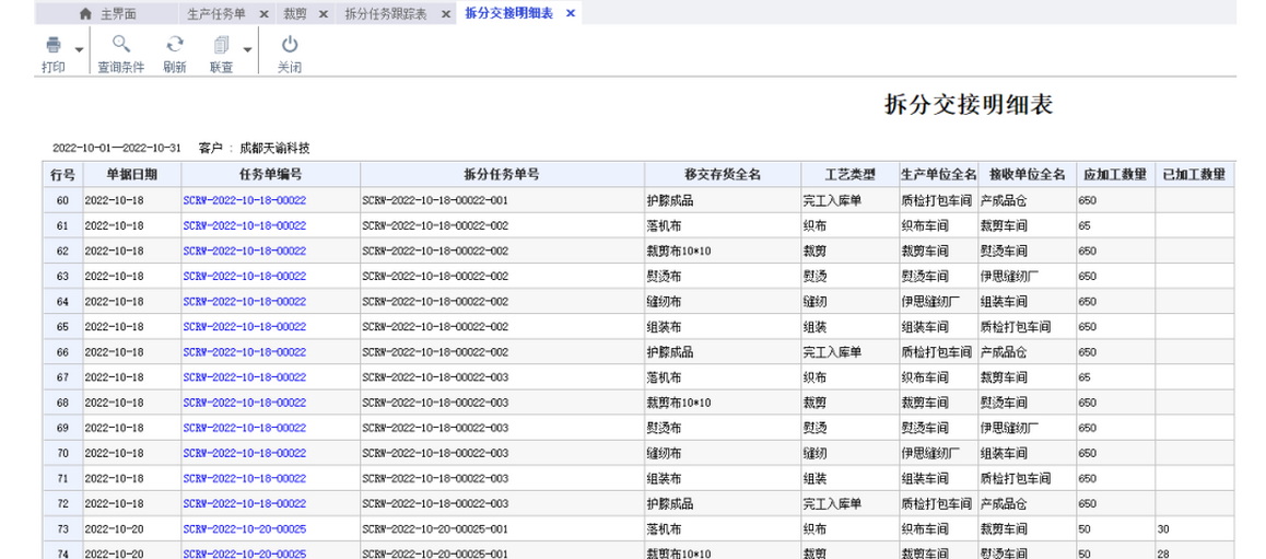 生产任务下达量大 实际生产时需进行分单操作,且按一定容具(如托盘、筐等)生产流转,整容具一次性交接。 应用价值 在生产任务下达环节确定数量,中间整容具流转时不再计数,只需减去不合格品,作为实际交接数量,简化流程,提升效率。 应用特点(特定条件) ① 任务单的完工数量即上表体的数量,同时等于交接过程中每一道工艺的完工数量; ② 不支持有半成品库存的生产(即前道工艺已有半成品,在后道工艺生产时部份使用半成品,部份从原材料开始生产) ③ 如果存在从半成品开始生产和原材料开始生产的情况,必须将任务单分成两次下达。 业务流程 业务操作 1.生产任务单拆分: 任务单应用下新增“拆分任务单”,输入每单拆分数量后点击“拆分”按钮自动拆分计算。 2.工艺流转卡打印: 可以将打印的二维码标签贴在相应的容器上,或卡片上。打印效果如下所示,该任务单拆分二维码可用移动端扫码后实现数量填写交接; 3.任务单扫码交接: 在交接时可以填写对应的做工人员信息,方便进行计件的操作,与自动生成计件工资结合,可以更好的服务于车间作业。 4. 查询报表: 可查询到每一个拆分单据的生产进度情况。 拆分交接表明细表,可以依据任务单或者拆分单查询其交接明细。