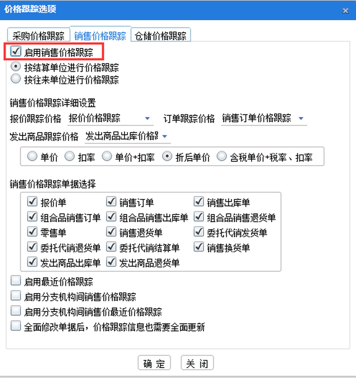01 销售管理-价格策略-基础价格策略-价格跟踪选项,勾选【启用销售价格跟踪】。