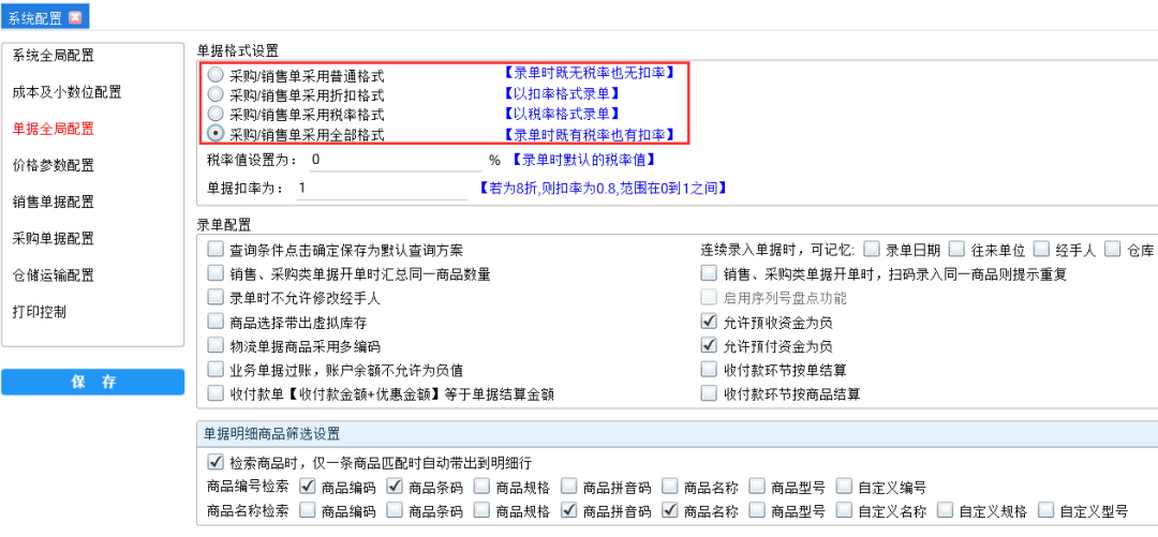 04 系统配置-单据全局配置,采用的单据格式要和价格跟踪的格式相符。如果价格跟踪选项跟踪的有扣率或者折后单价,就必须要选择采用折扣格式或者全部格式;如果价格跟踪选项跟踪的有税率,就必须要选择税率格式或者全部格式。