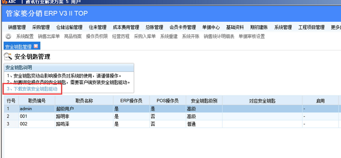 3、如果操作员权限中不包括上述三个权限之一,那么该操作员既可绑定高级钥匙,也可绑定普通钥匙。