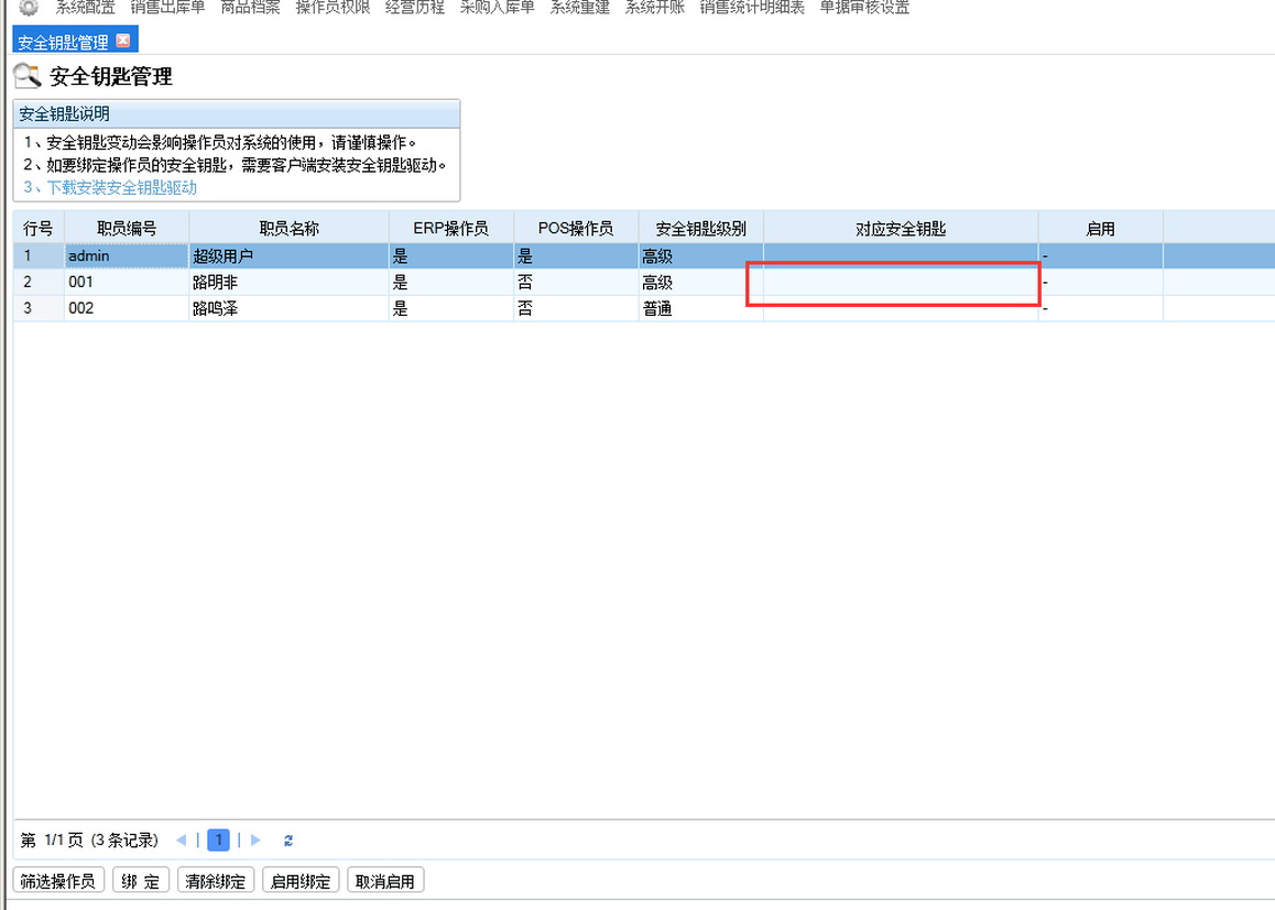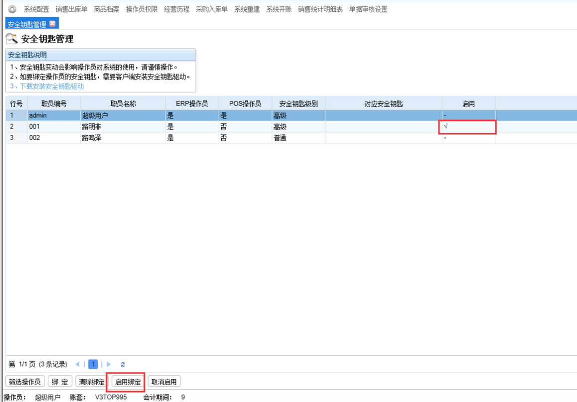或要启用安全钥匙,只需要选定操作员,然后点启用绑定按钮即可。如果要取消启用,点取消启用按钮即可。