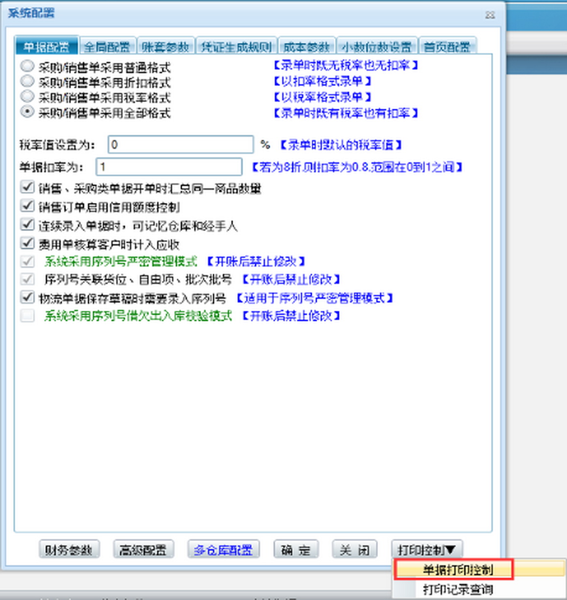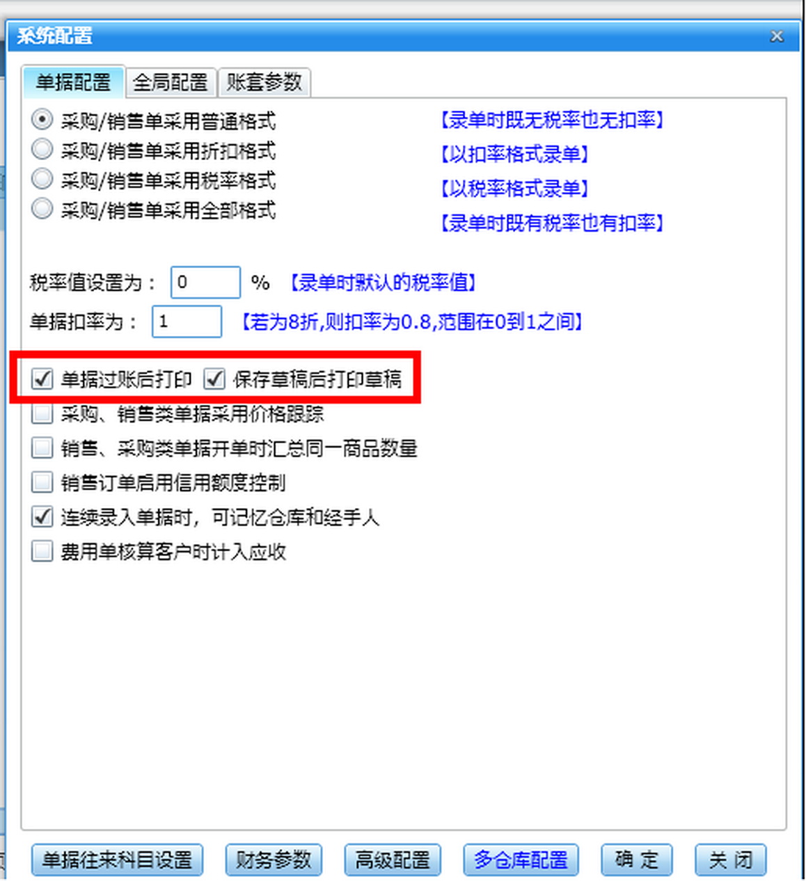 系统管理——系统设置——系统配置——单据配置——配置【单据过账后打印】和【保存草稿后打印草稿】。