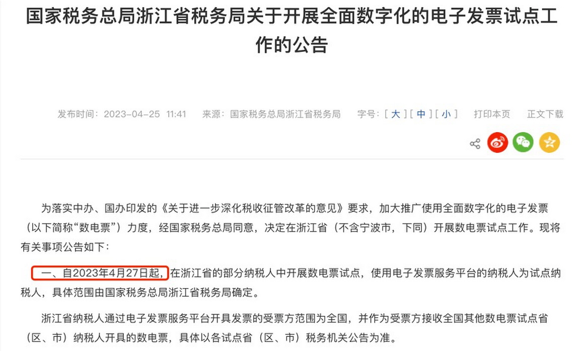 2023年4月25日,浙江省、山西省、甘肃省、江苏省、辽宁省税务局分别发布公告,在所辖部分纳税人中开展数电票(全电发票试点),据不完全统计,截止目前,全国数电票开展试点省份已经达到21个。