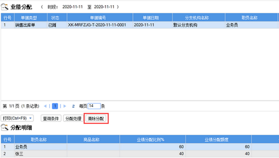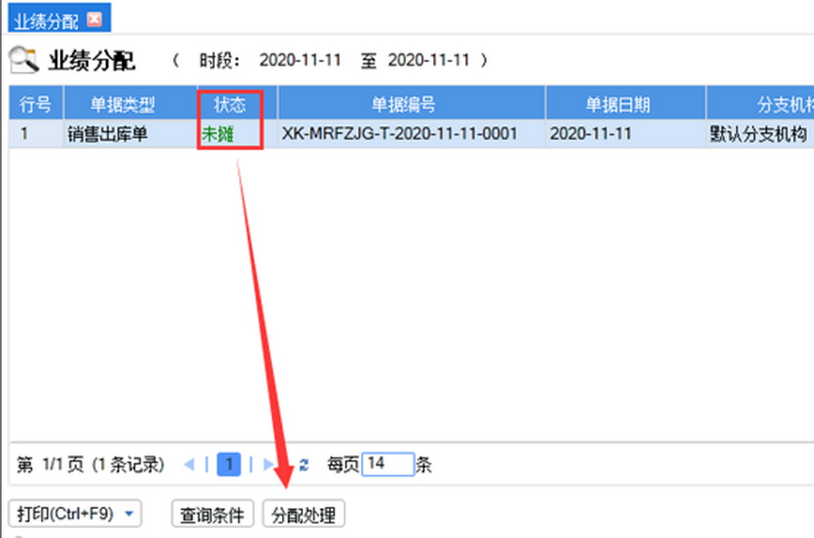 成本费用管理—提成管理—业绩分配—选择一张状态为未摊的单据(这里以销售出库单为例)—点击下面的分配处理按钮。