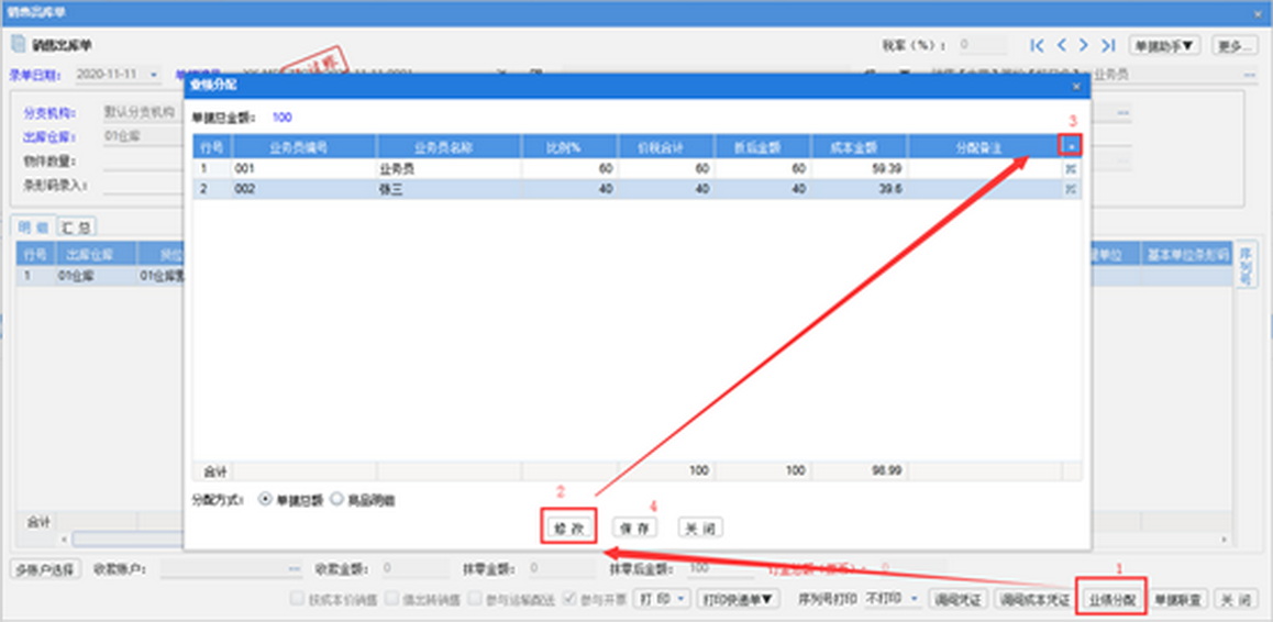在弹出的原始单据界面点击下面的业绩分配按钮—在弹出的界面点击修改按钮—再点击右上角的小+号新增一行,默认第一行就是单据上是经手人,新增的第二行选择需要分配业绩的另一个人,分配多人的就新增多行即可。在比例一列输入需要分配给此职员的业绩占总金额的比例,总计是100%即可—最后点击保存按钮—提示数据保存成功,点击确定—然后点击单据上的关闭按钮,这张销售出库单就分配业绩完成。