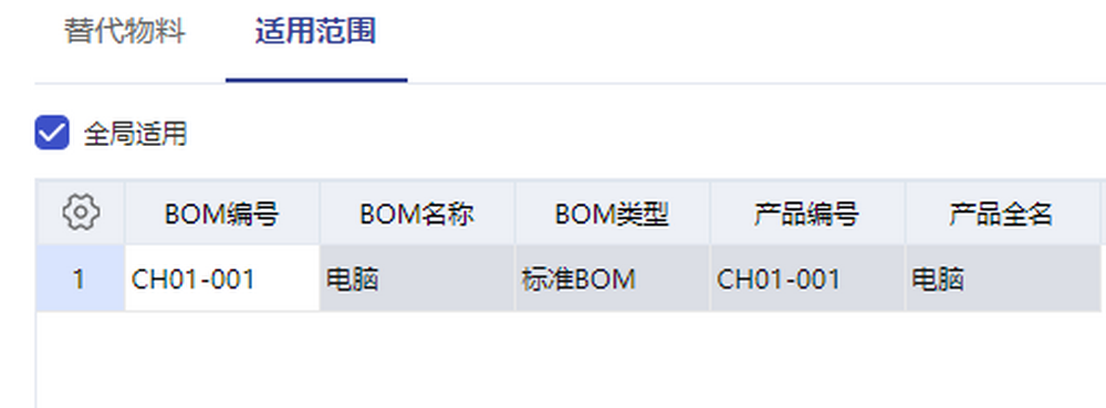 适用范围:全局适用或者部分适用,全局适用表示在所有BOM中,都可以使用该替代关系。若未启用全局适用,则可以选择适用的BOM范围。