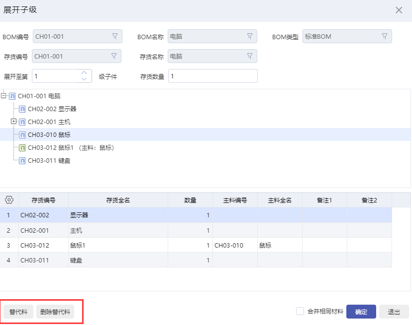 有时候根据客户或生产情况特殊需求,只能在某一张任务单或加工单使用某一个替代料,则可以在展开子级界面,选择子件的替代料。
