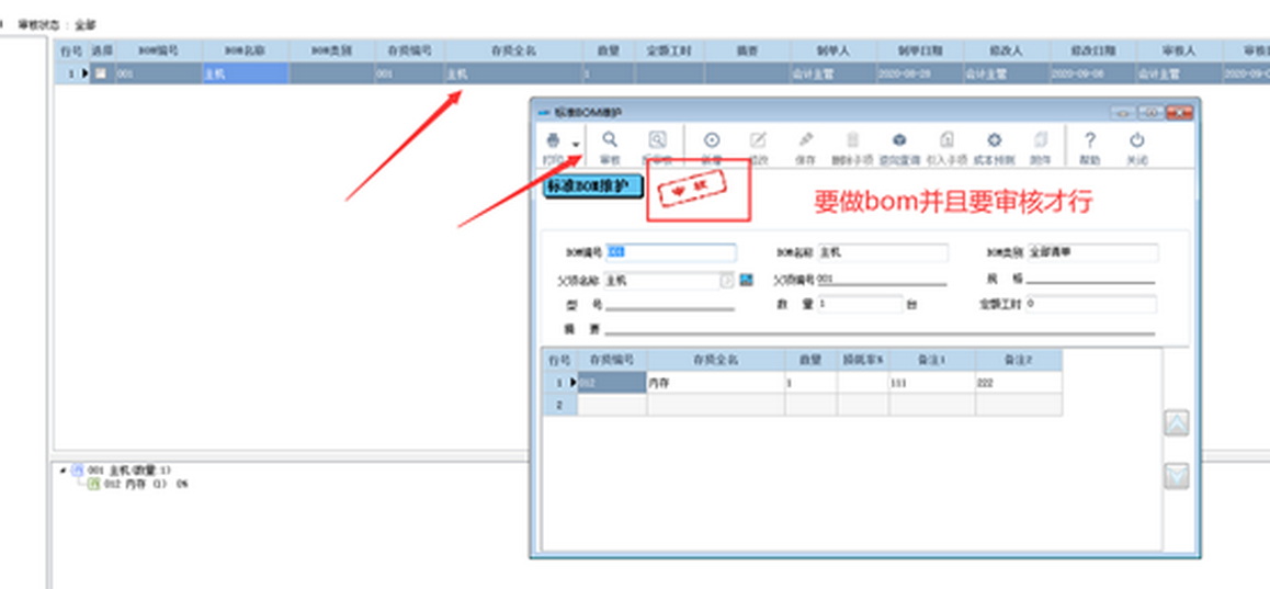 通过【基础资料】—【生产资料】—【标准BOM】检查其中是否已做相关BOM并审核。