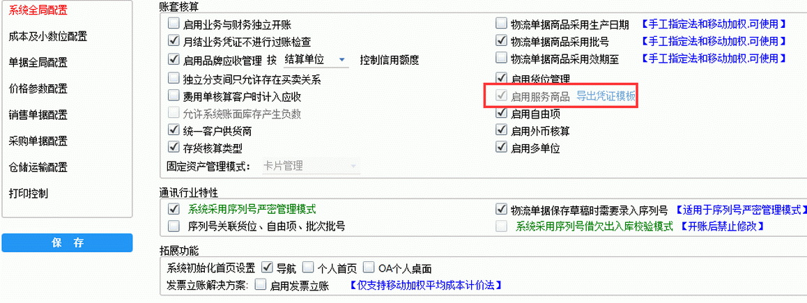1、首先将系统管理—系统启用—系统配置—系统全局配置—启用服务商品打钩;