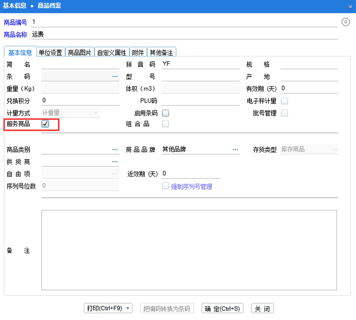 2、在商品档案里单独新建一个商品,名称可以就叫运费,然后将服务商品选项打钩;