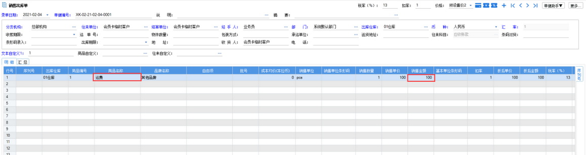 3、接下来我们就可以直接将运费这个商品作为服务商品在销售出库单中销售了,运费是多少,服务商品的金额就填写多少即可。下面的收款账户和收款金额不填,单据过账后,直接就会挂到应收账款上。