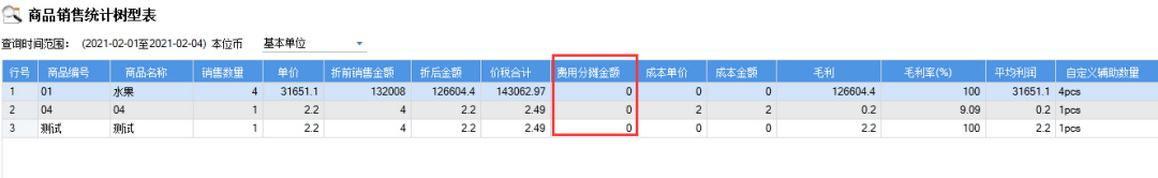4、后续查询报表,例如:销售管理—报表—查询统计—商品销售统计,就可以在【费用分摊金额】列查看到费用分摊的金额。