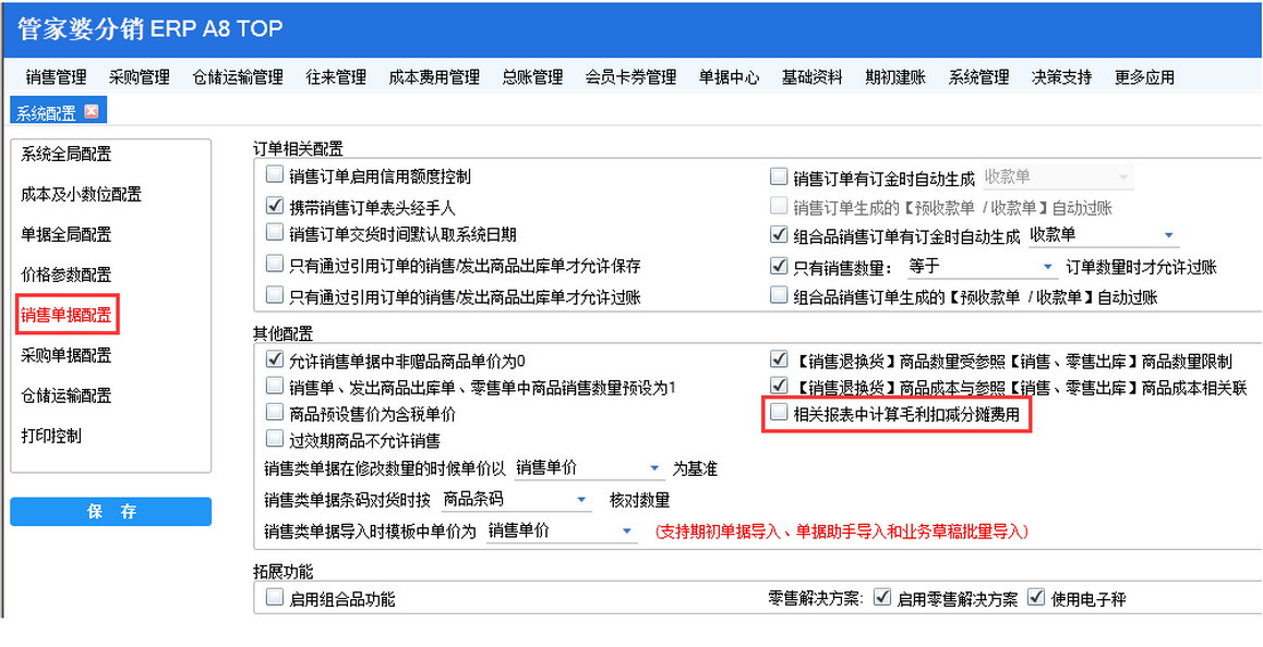 注:系统配置—销售单据配置—相关报表中计算毛利扣减费用分摊,勾上了之后查询报表毛利就会扣减费用分摊金额。