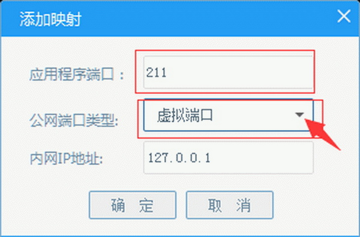 (1)应用程序端口输入211,公网端口类型选择虚拟端口,如图。