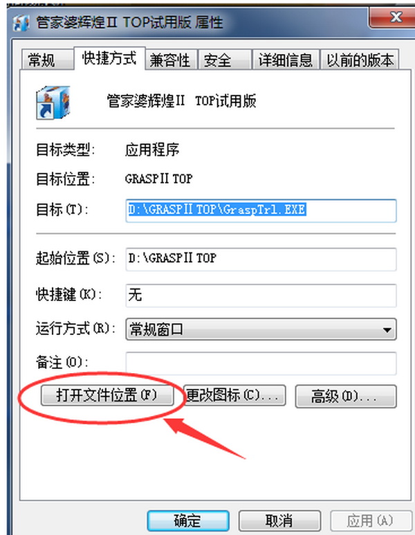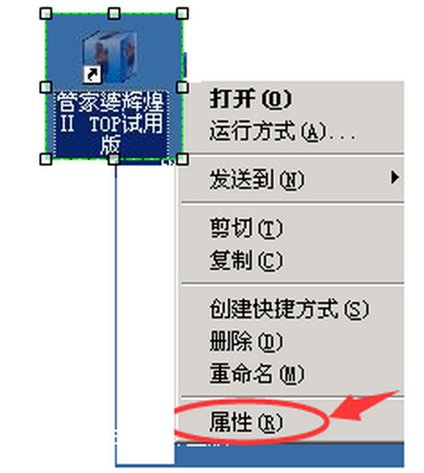 (3)在管家婆PC分机访问端上单击鼠标右键在弹出的菜单里单击“属性”打开安装目录如下图: