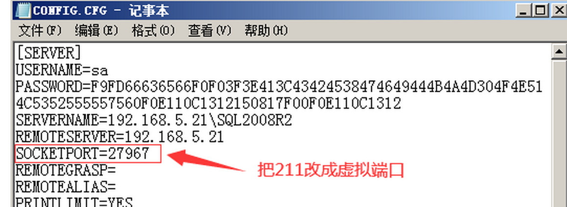 (6)把“CONFIG.CFG”下面的“SOCKETPORT=211”改为“SOCKETPORT=虚拟端口”比如,前面生成的虚拟端口是27967,就改为SOCKETPORT=27967”,然后保存。