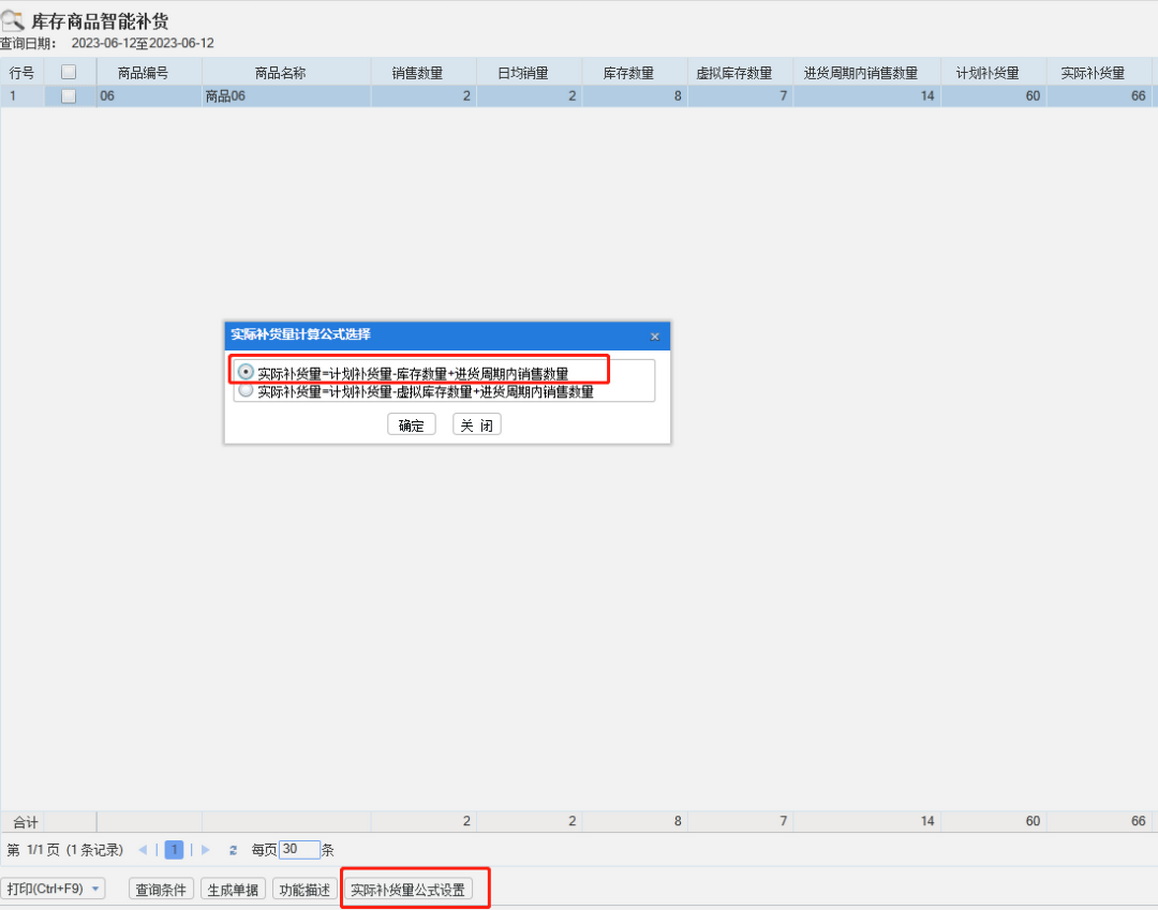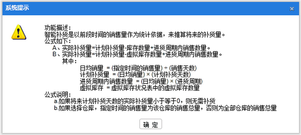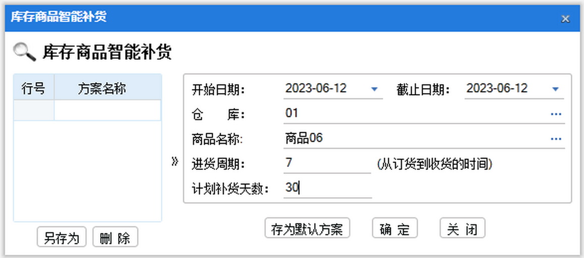 计划补货天数、进货周期由用户指定。若选择某仓库,则计算该仓库的销售情况,否则为全部仓库的销售情况。