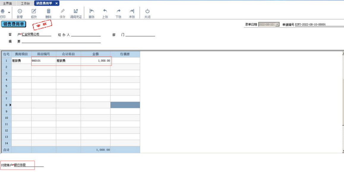 ② 在销售费用单中,录入相关费用、会计科目、金额等信息,如图1所示。