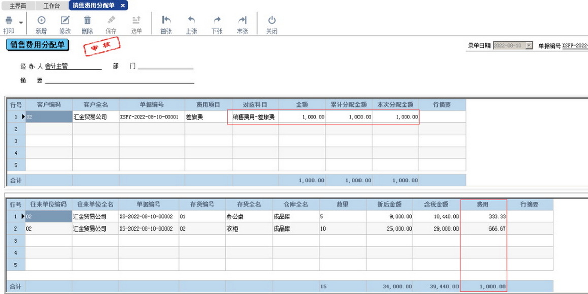注意:金额分配可以通过手工分配、自动分配两种方式(自动分配支持按数量、按折后金额、按含税金额)。